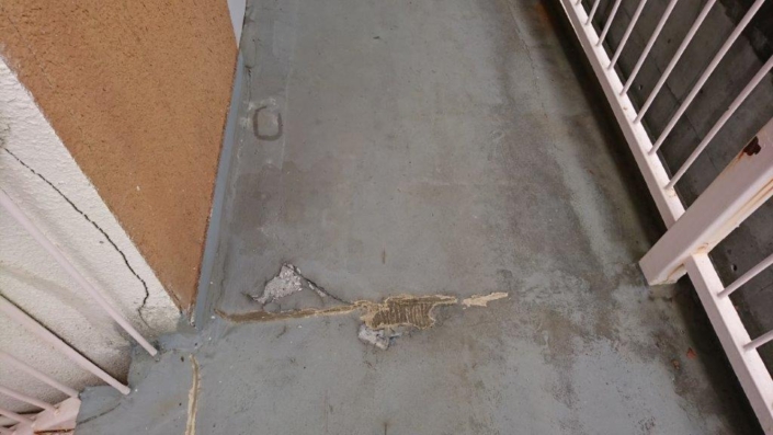 - 共用廊下の既存防水層への亀裂・剥がれ