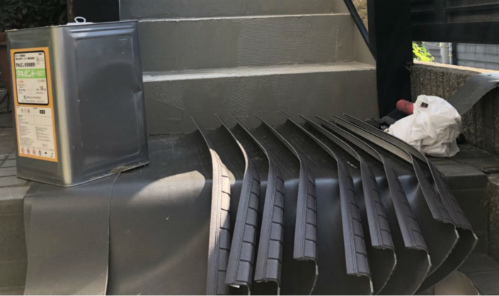 今回は調査の内容を踏まえて、外階段の下地補修を徹底的に行った上で、既存の側溝・幅木はウレタン塗膜防水密着工法を施し、防滑性の高いノンスリップ性の長尺シートを貼り付ける防水工事をご提案させて頂きました!