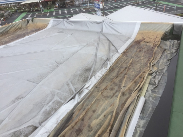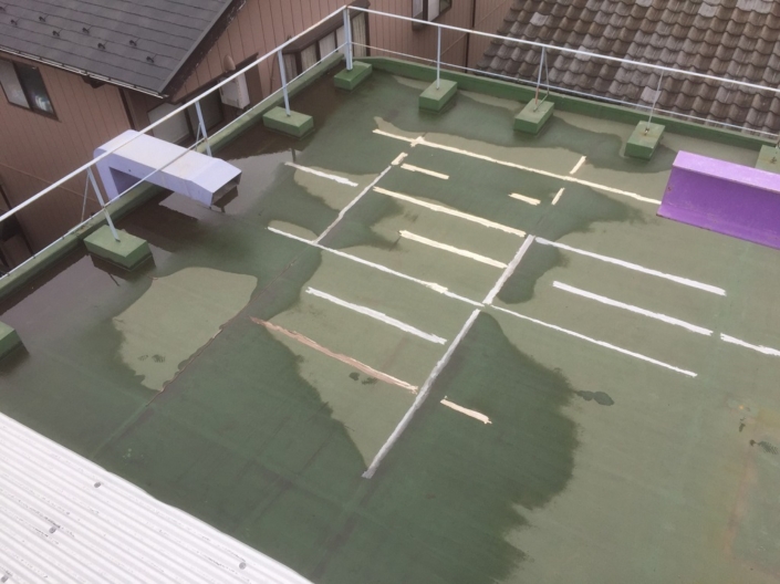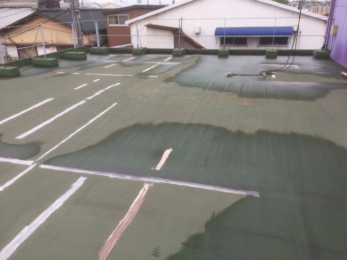 経年の劣化により既存の防水層にひび割れなどが発生してしまい、雨水が侵入してしまった模様。かなり広範囲に雨水が侵入してしまっているので、防水性が著しく低下していると言っても過言ではありません。
