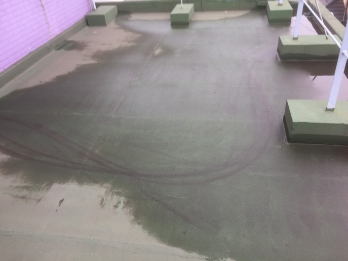 まずパッと見の段階で、屋上の平場には雨シミが大きく広がってました。