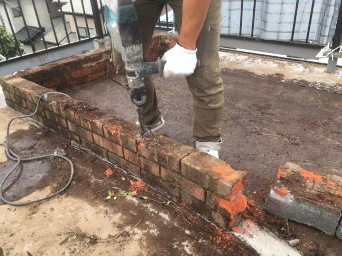 まずは屋上に造設されている花壇を解体し、土壌をスコップなどで掘り起こして撤去する作業からのスタート。