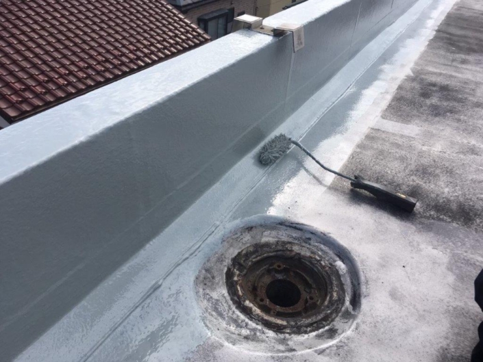 前回までで、高圧洗浄・下地処理が完了しているので、今回は本格的に防水工事を進めました。