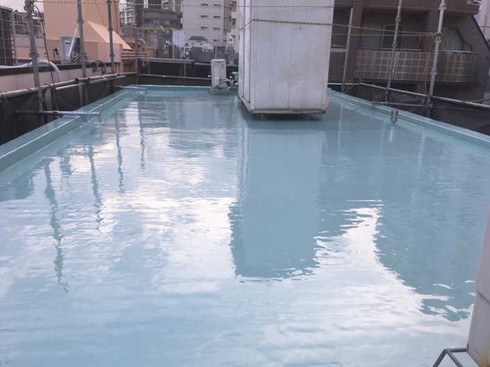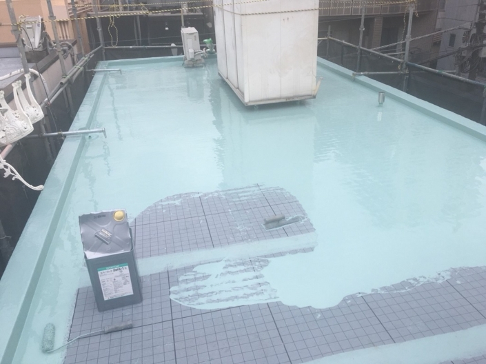 まずは笠木、架台などに先行してウレタン樹脂を塗布します。その後、平場(床面)に継ぎ目を作らないように、ウレタンを流し込みます。