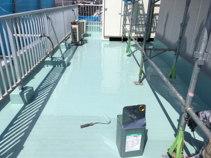 前回、1層目のウレタン塗布が完了しているので、本日は2層目のウレタンを屋上全体に塗布していきます。