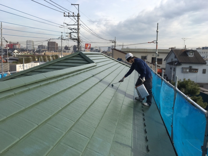 前日に屋根の下塗りまで完了しているので、今日は上塗り塗装を中心に作業を進めました。