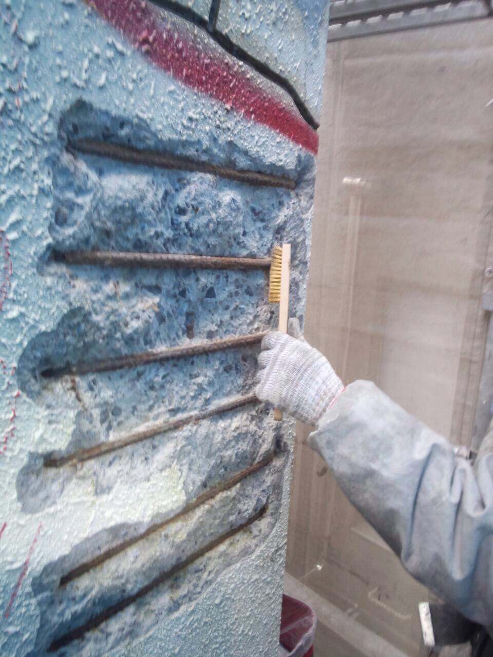 鉄筋の錆を【ワイヤーブラシ】で入念にこすり錆を落としていきます。