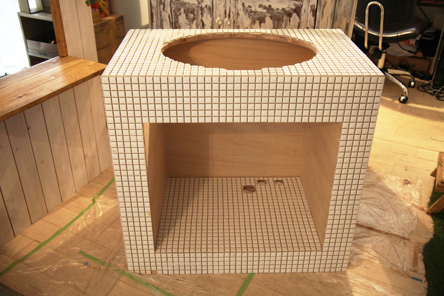 乾かないうちにタイルを張っていきます。スピードが命です‼