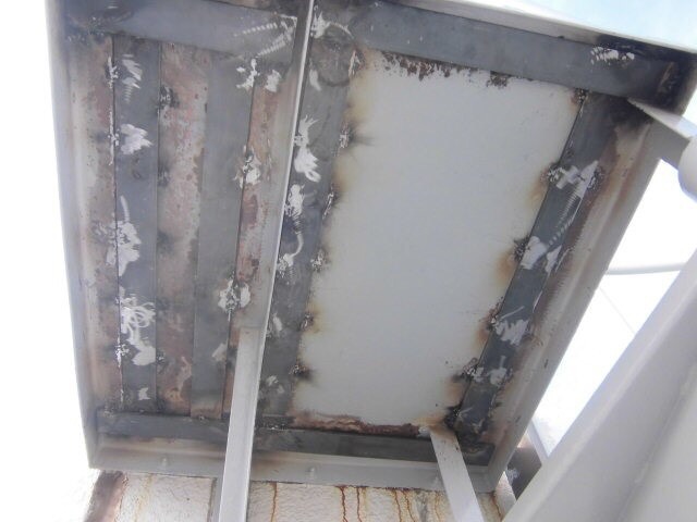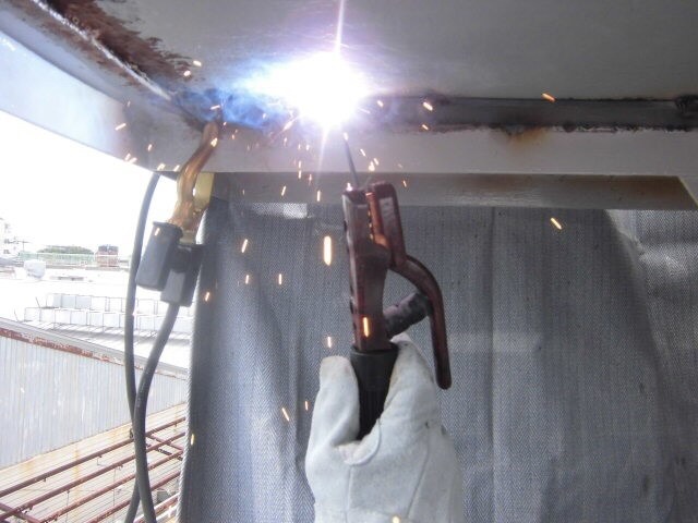 アーク溶接中↓↓↓(鉄のアングルで床が抜けないように補強します。