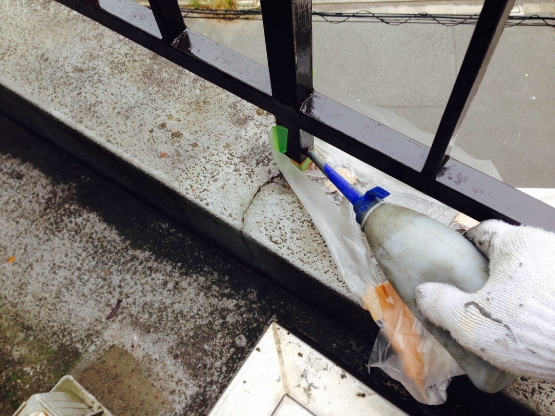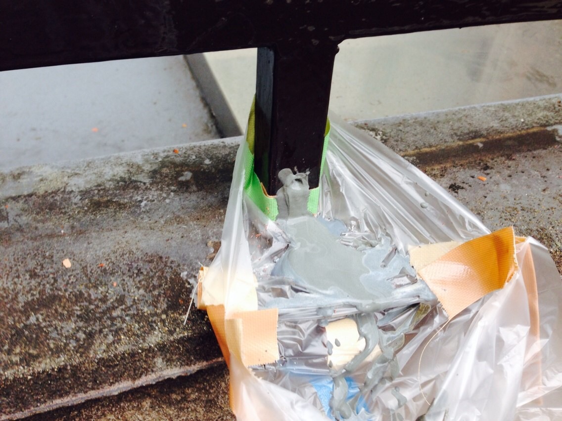 防錆グラウト材を充填します。(これで手摺支柱内に溜まる水もありませんので錆びて手摺が落ちそう...など心配ご無用になります)