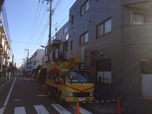 高所作業車を使っての雨漏り調査になります。