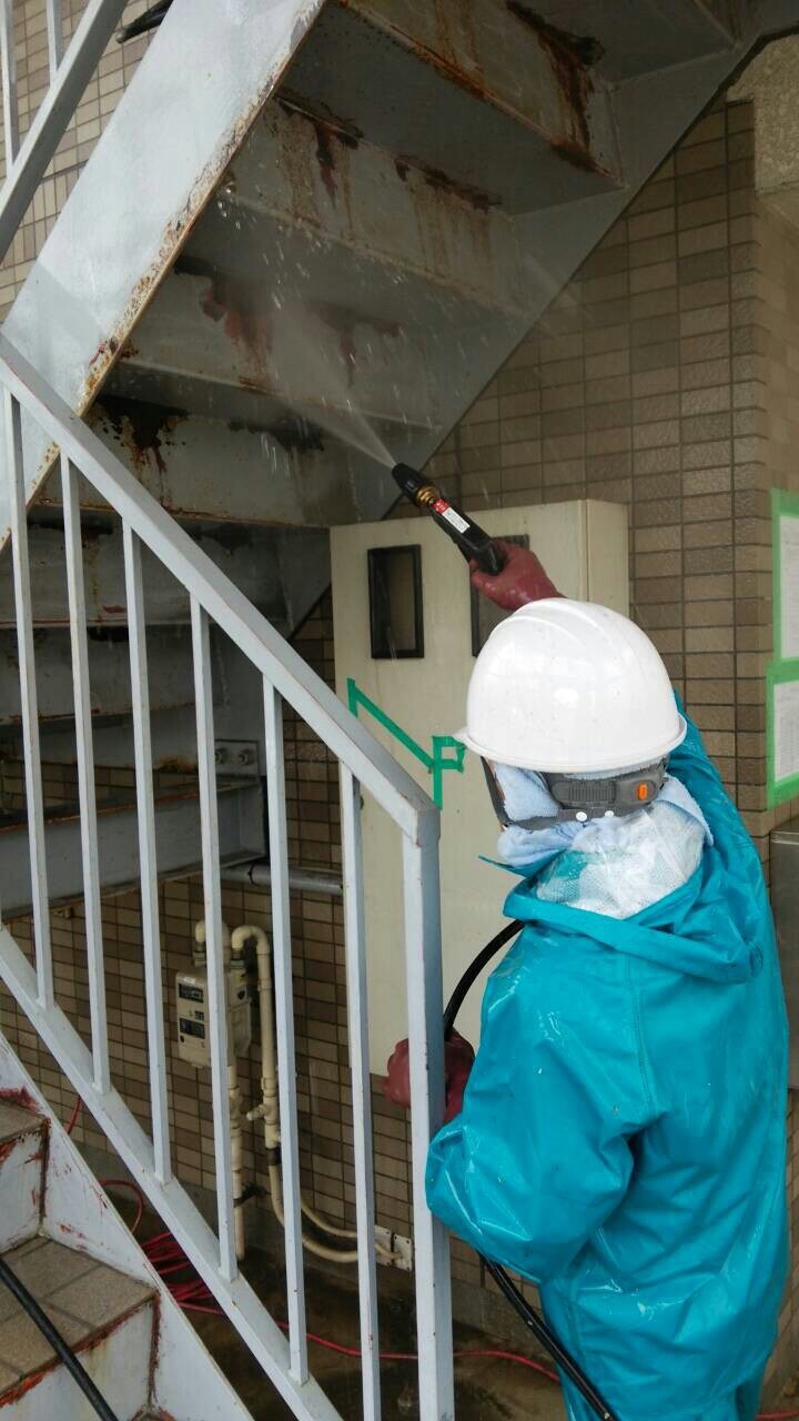 洗浄と併用にて鉄部のケレン作業もしております。電動工具なども使用する3種ケレンでの下地処理になります。