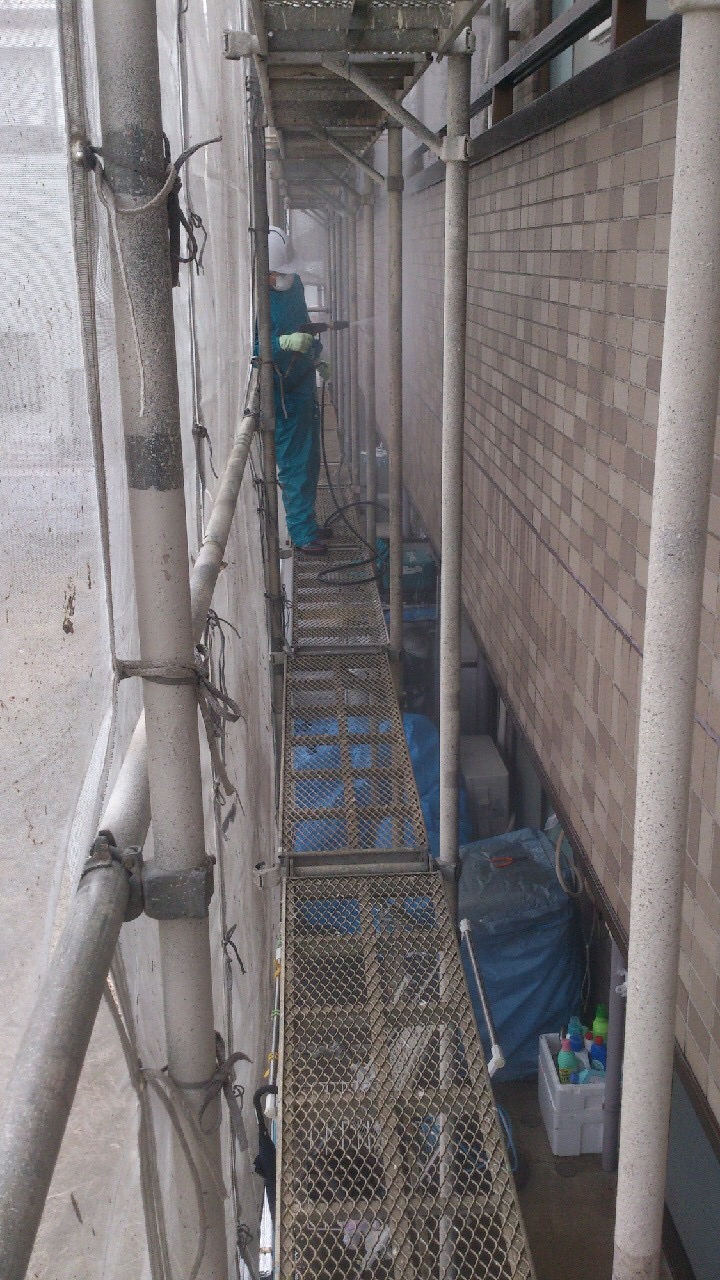 Iマンションは外壁がほぼほぼタイル面になりますので薬品洗浄&高圧水洗浄のコラボレーションでの洗浄になります。