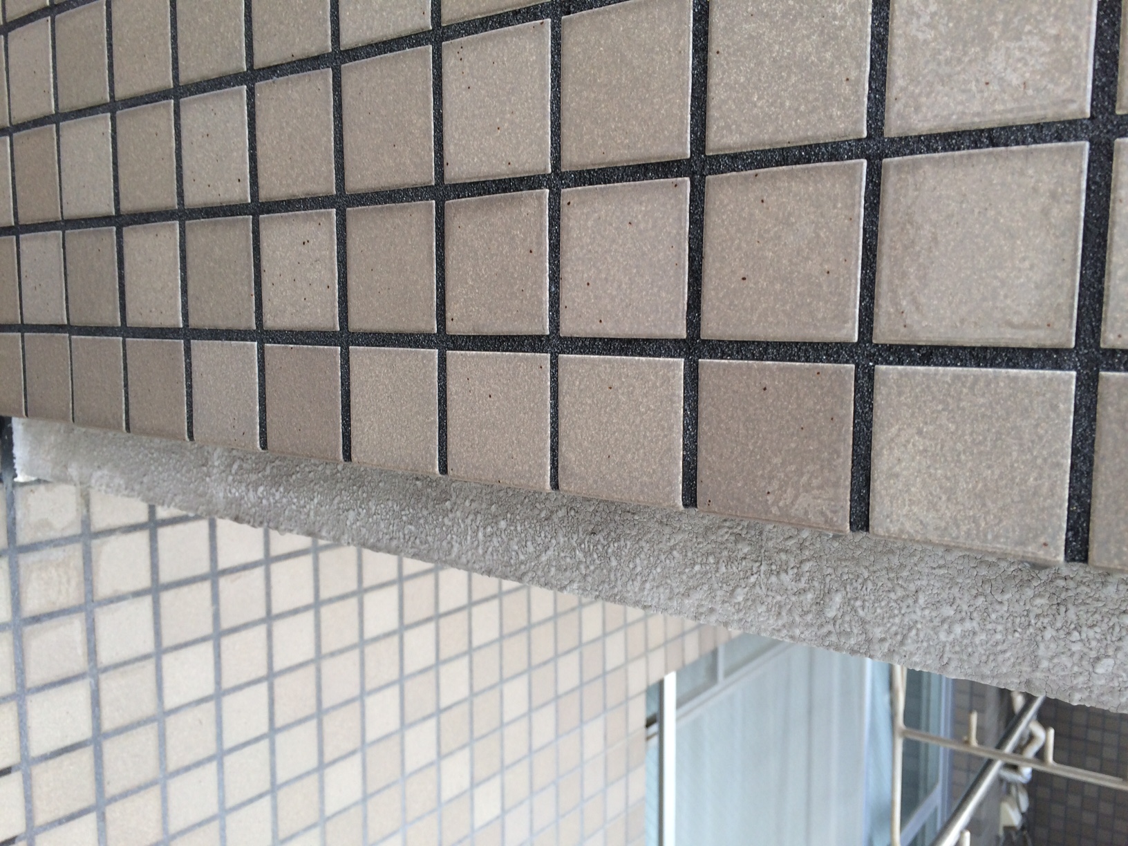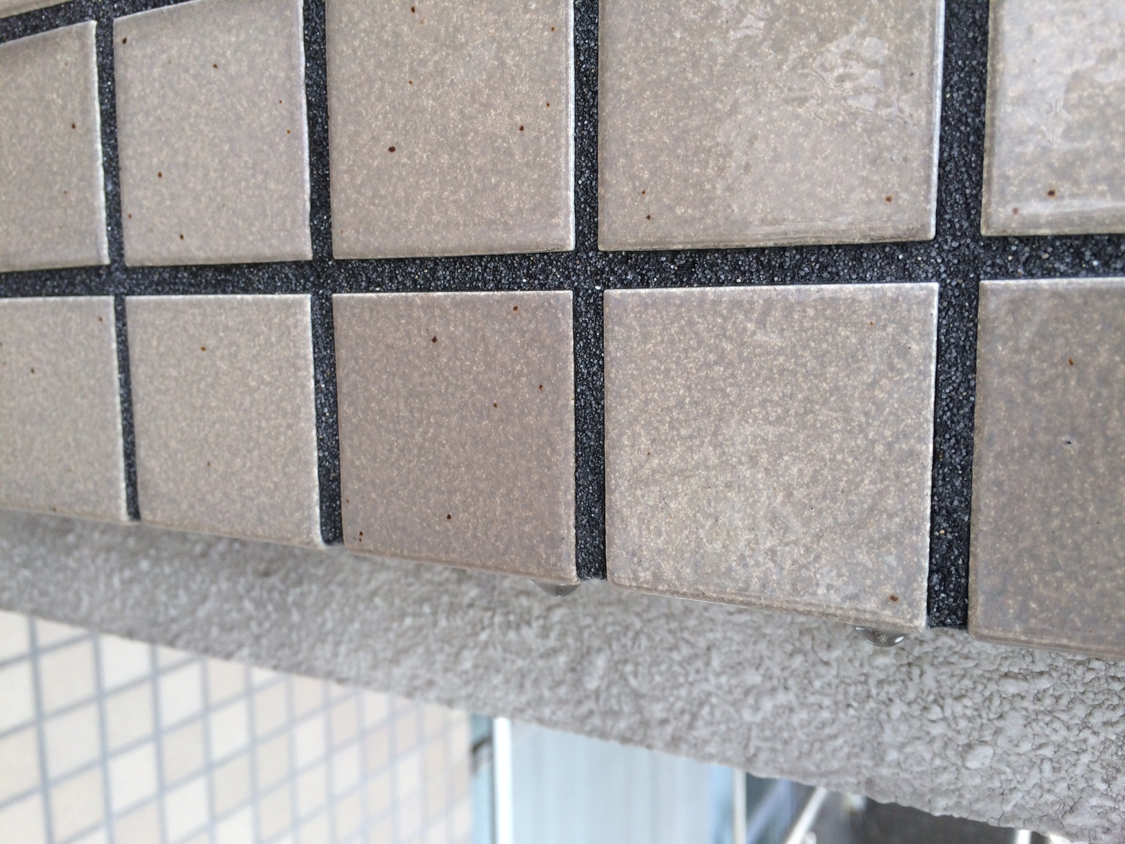 外壁タイル面各所にに黒ずみがみられます。 この黒ずみを落とすには高圧水洗浄では全く落ちません。まったくのまったくです。。。