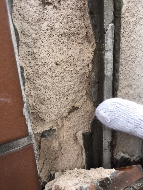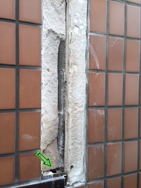 写真でもわかるように欠損部をたどっていくとサッシに向かって水みちができているのが確認できます。