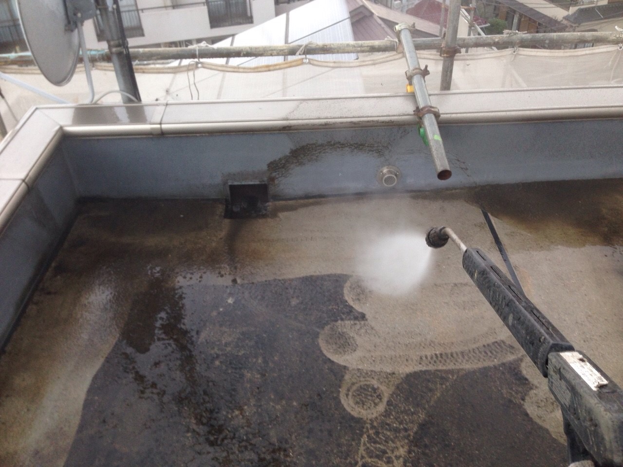 下地調査からタイル張り・シーリング・下地工事後はお決まりの高圧洗浄。