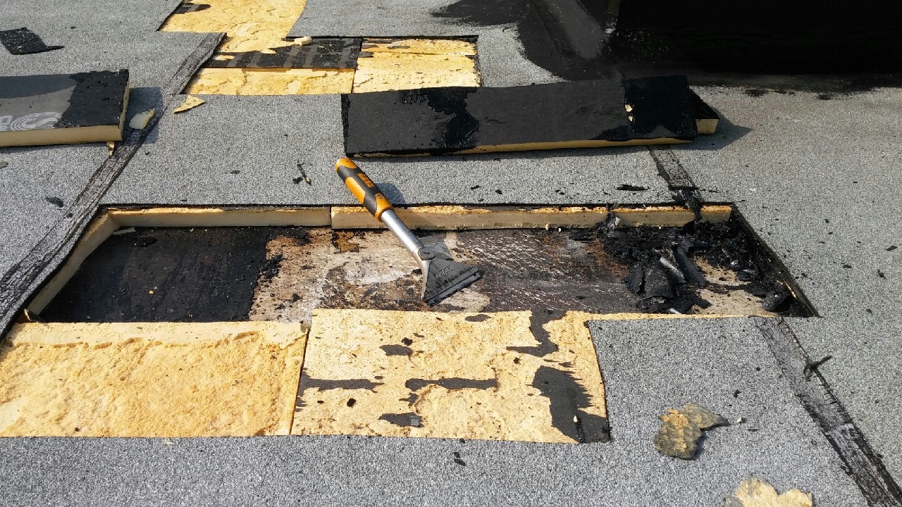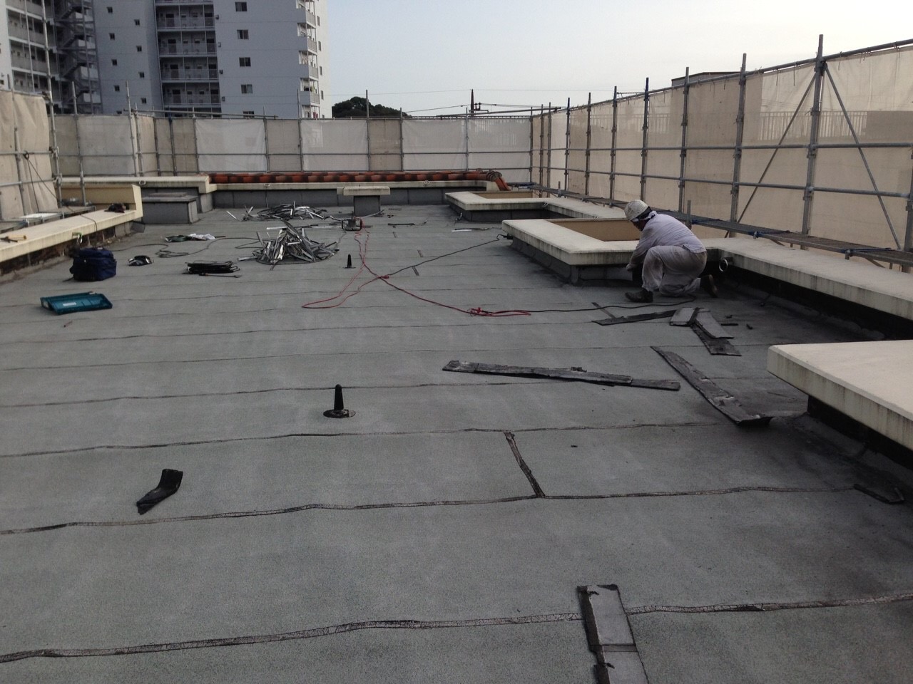 既存防水層に膨れが多々ありましたので立上りは全撤去、平場は部分補修を入れてからの防水工事となります。