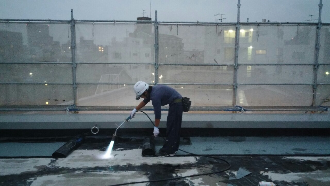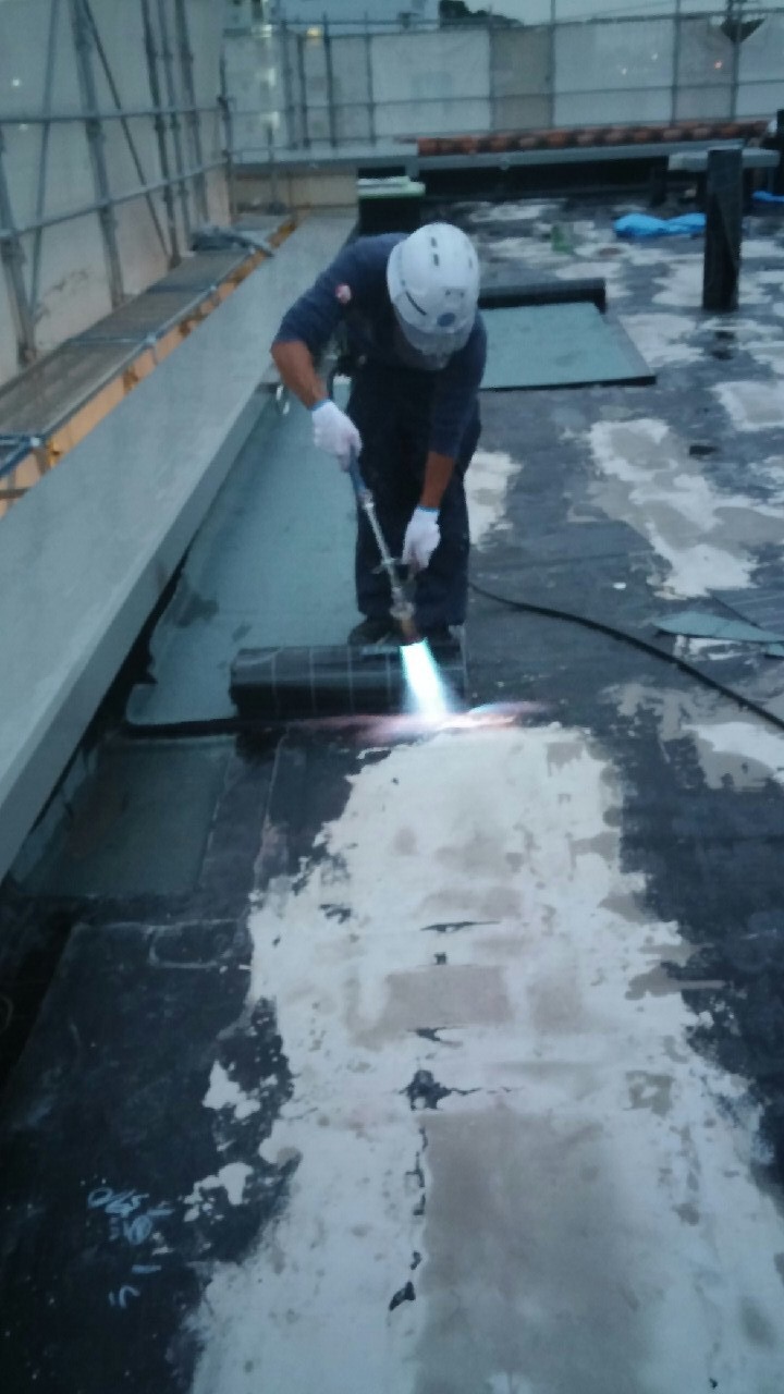 アスファルトトーチ工法ですので、シートをバーナーで炙りながら貼っていきます!