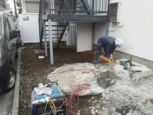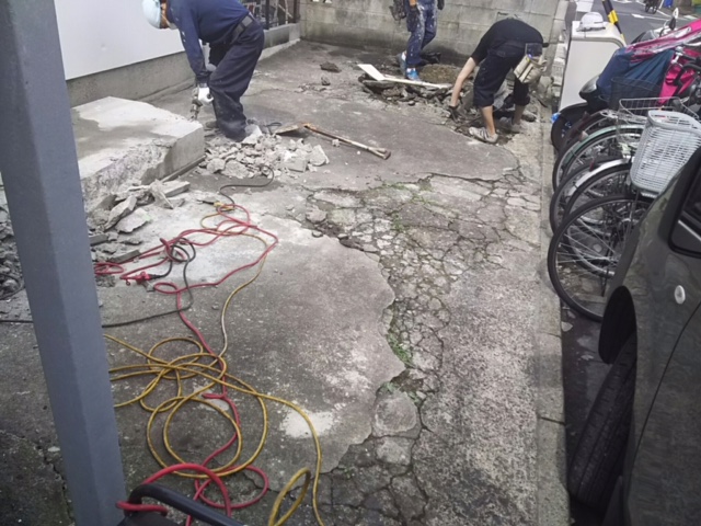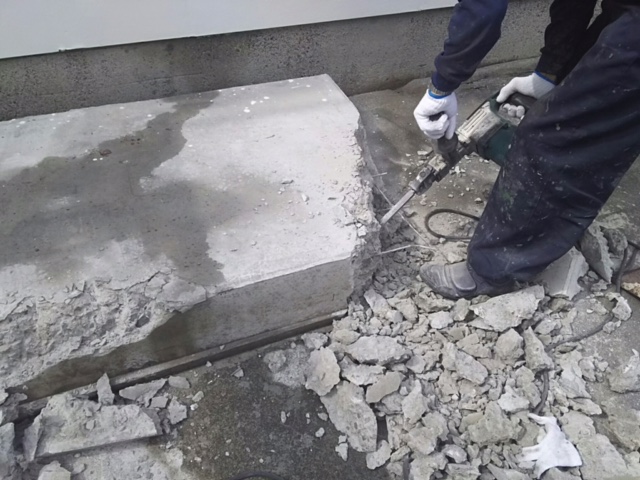 ひび割れ・浮きがありますので土間打ち直し。