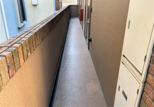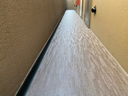 滑りにくい加工と、対候性もあり、集合住宅の開放廊下に最適な素材です。