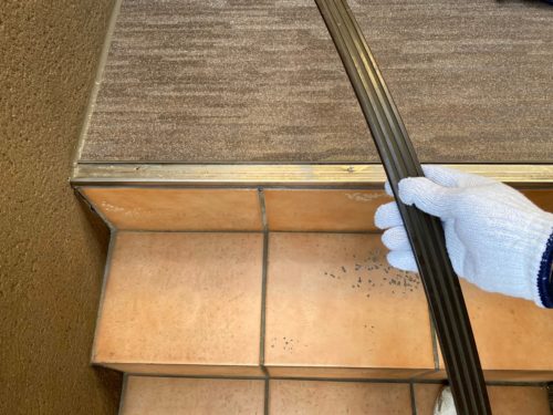 アパート開放廊下の床シート張り替え作業を行っております。
