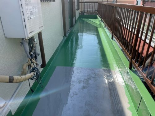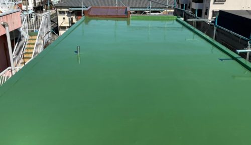 陸屋根の屋上部のトップコートも塗布が完工し、乾くのを待ちます。